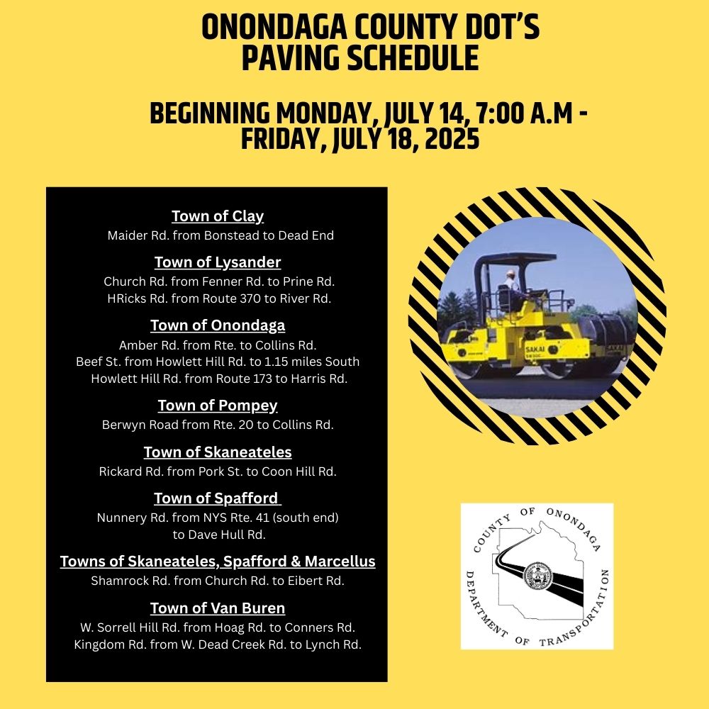 Onondaga.gov Department of Transportation Paving Schedule for Monday, July 14- Friday, July 18, 2025 Paving Schedule for Monday, July 14- Friday, July 18, 2025 July 11, 2025 Traffic Alert/Work Zone Updates Share This Share on Facebook Share on Twitter Share through Email Print