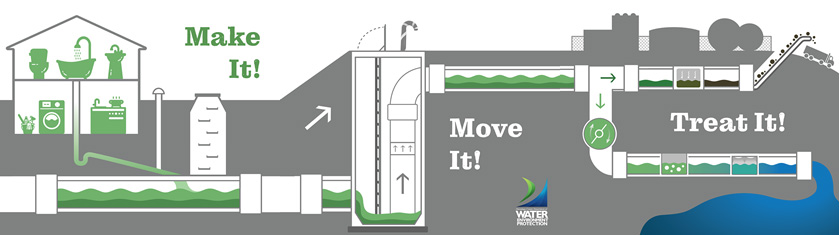 Every time you use water at home, it flows into a series of pipes connected to your sinks, toilets, and appliances. These small pipes leave your home and connect to larger sewer pipes that collect wastewater from your neighbors, local businesses, and industries.