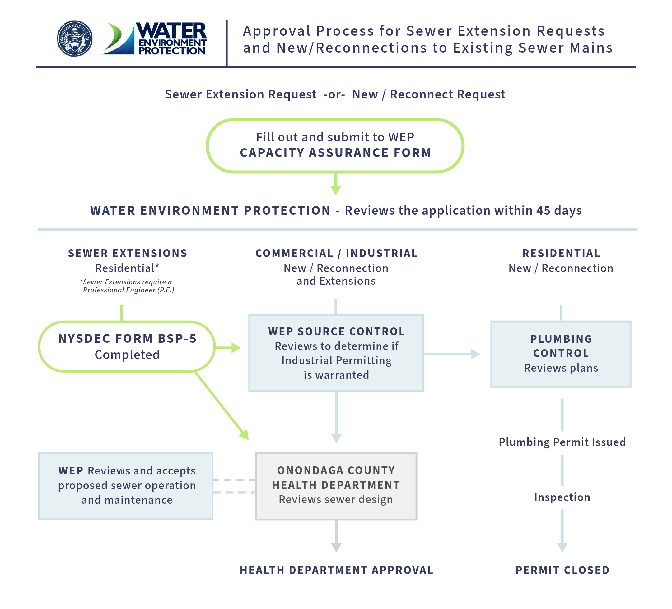 WEP’s Capacity Assurance Program evaluates requests for sewer service connections to ensure the sewer system can handle the additional flow of wastewater. Capacity Assurance reviews are required for all new lateral connections to existing sewer mains and for the re-use of existing laterals before they can be reviewed and approved by the Onondaga County Health Department and a permit for the work can be issued by WEP Plumbing Control.