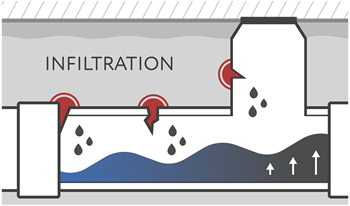 Groundwater can infiltrate into sewer pipe locations that become vulnerable with time such as leaky joints, cracked pipes, and deteriorated manholes.