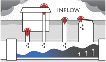 Rainwater can inflow into the sewer system directly through improper connections such as foundation drains, roof drains, storm drains, and defective manhole covers.